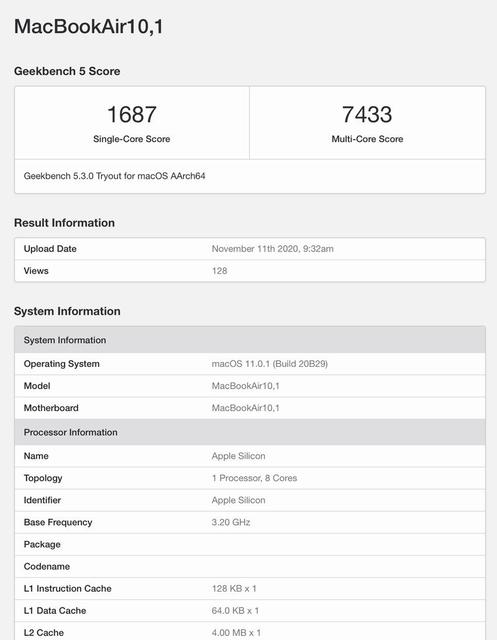 MacRumors, Geekbench veritabanında yeni MacBook Air’i tespit etti. Cihazın test modelinde 8 GB RAM ve maksimum 3,2 GHz saat hızında çalışan tescilli bir Apple M1 çip bulunuyor. Tek çekirdekli testte SoC 1687 puan, çok çekirdekli testte ise 7433 puan alıyor.