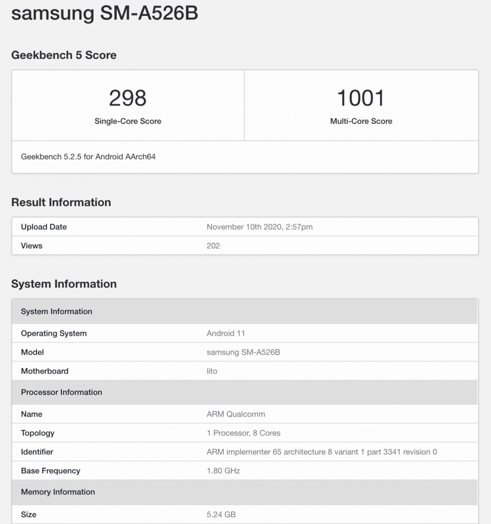MySmartPrice’daki bloggerler, Koreli üreticinin Geekbench karşılaştırma veritabanında SM-A526B model numaralı yeni bir akıllı telefonunu fark ettiler . Görünüşe göre, bu A52 5G.