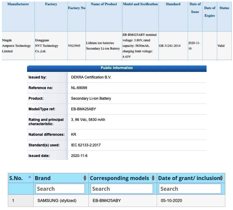 SamMobile’a göre SM-M425F model numaralı Galaxy M42, Çinli düzenleyici 3C (China Compulsory Certification) tarafından onaylanmıştır. Belgelere göre cihaz, 6000 mAh hacim alacak olan EB-BM425ABY batarya ile donatılacak. Bu arada, böyle bir bataryaya sahip cihaz da Hint ajansı BIS’de göründü.