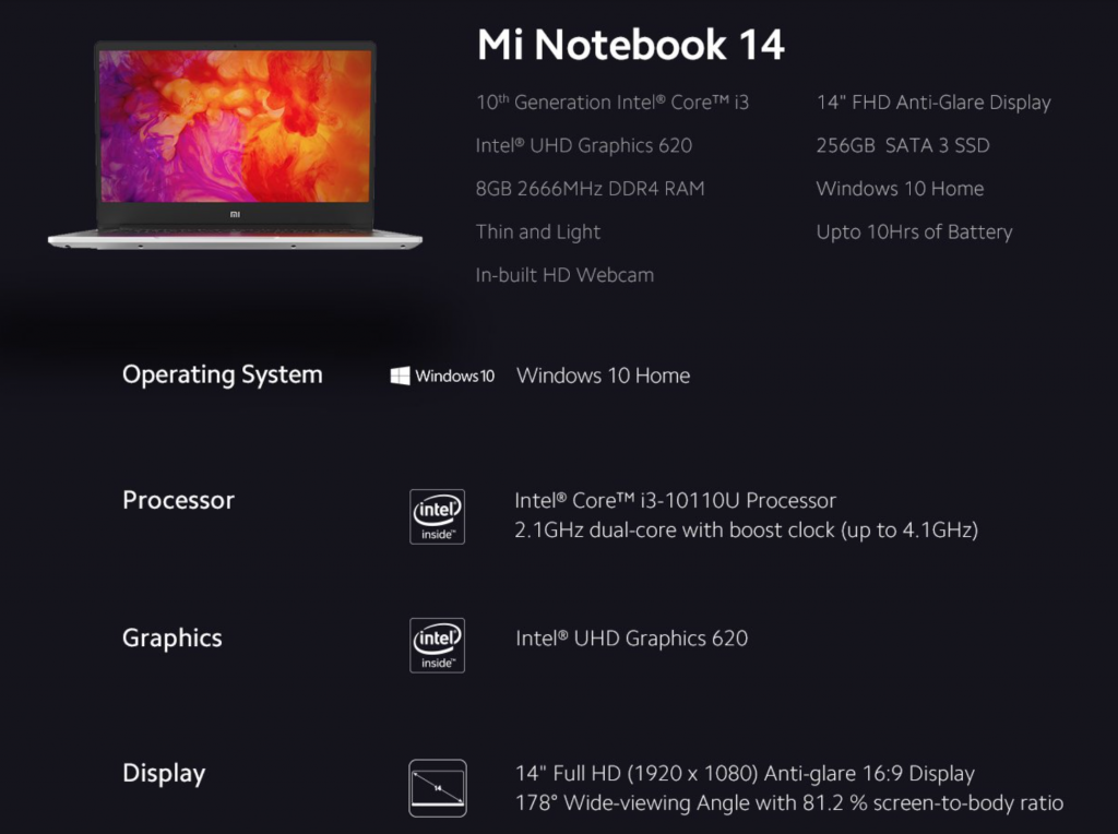 Yenilik, maksimum 2,1 GHz saat frekansı, 4,1 GHz’e kadar Turbo Boost ve Intel UHD Graphics 620 ile 10. nesil Intel Core i3-10110U çift çekirdekli işlemci tarafından desteklenmektedir. Çip, 8 GB RAM ve bir SATA 3 SSD sürücüsü ile eşleştirilmiştir. 256 GB. Dizüstü bilgisayar, tam boyutlu bir klavye ve DTS teknolojisine sahip 2W stereo hoparlörlerle birlikte gelir. Mi Notebook 14 E-learning Edition’daki bağlantı noktalarından iki USB Type-A (USB 3.1 Gen 1), bir USB Type-A (USB 2.0), bir HDMI, bir 3.5mm kulaklık girişi ve bir güç girişi vardır. Dizüstü bilgisayar, çift bantlı Wi-Fi 5 ve Bluetooth 5.0’ı destekler.