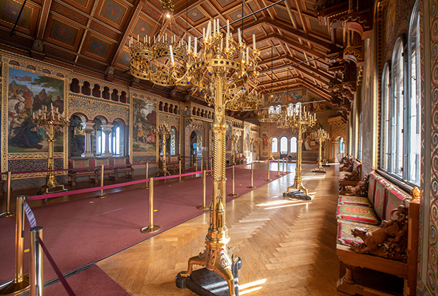 Neuschwanstein’ın iç mekanları, çevresinin baskısı altında, ruhani idolünden uzaklaşmak zorunda kaldıktan sonra bile kralın hayal gücünü rahatsız eden Wagnerci motiflerle doluydu. Sarayın merkezi odası – Şarkıcılar Salonu – Wagner’in opera-gizemi “Parsifal” dan sahnelerin yer aldığı bir panelle dekore edilmiştir. Salon başlangıçta bir konser salonu olarak tasarlanmıştı, ancak sadece 20. yüzyılda bu şekilde kullanılmaya başlandı.